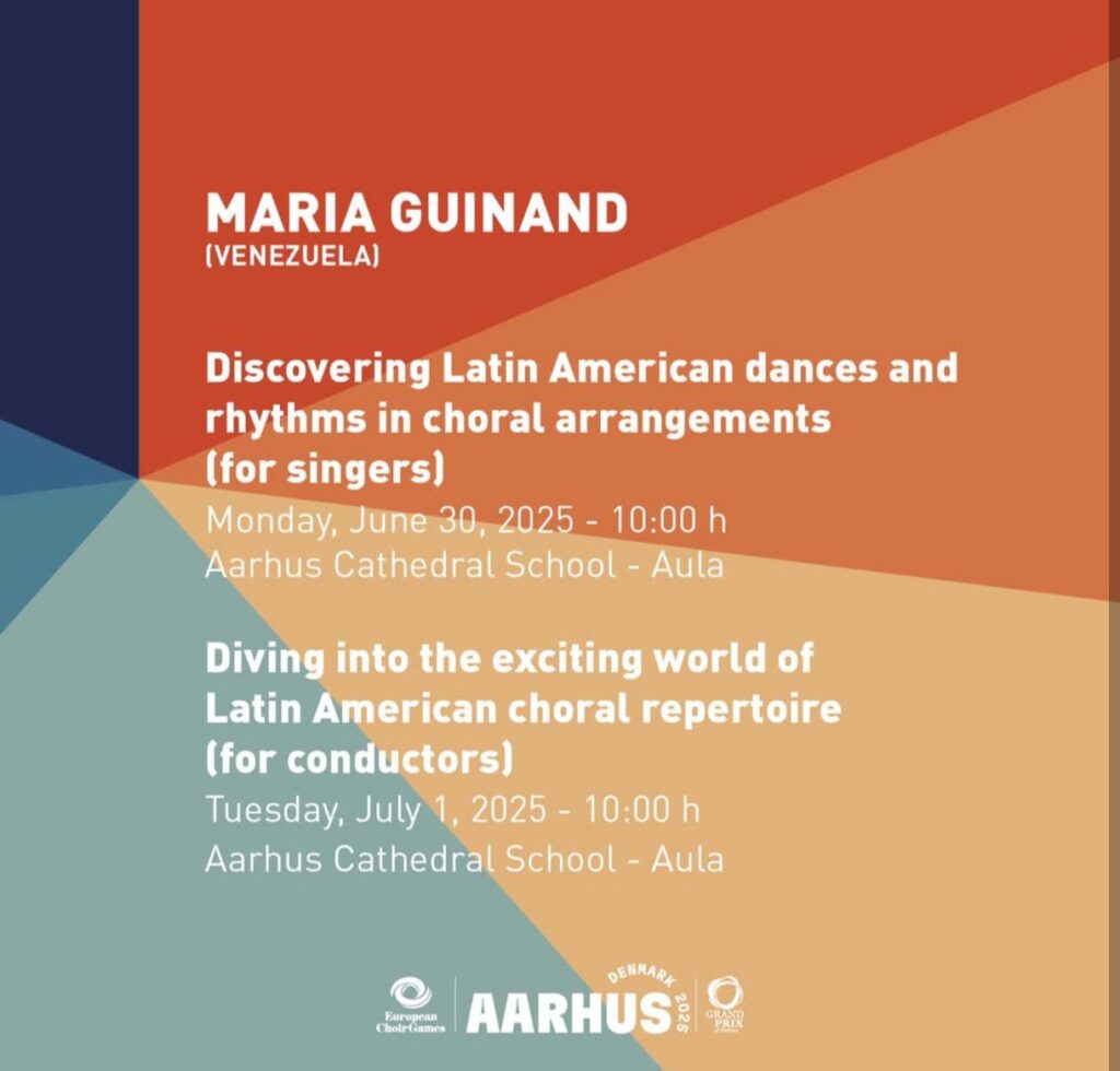 El segundo estará dirigido especialmente a directores corales se titula: Sumergiéndonos en el apasionante mundo del repertorio coral latinoamericano. En este taller, la maestra María Guinand explora las ideas y propuestas innovadoras de compositores latinoamericanos contemporáneos en el repertorio coral latinoamericano, con un enfoque en nuevas composiciones y arreglos corales. Ayudando a descubrir a algunos de los compositores más aclamados de la región.